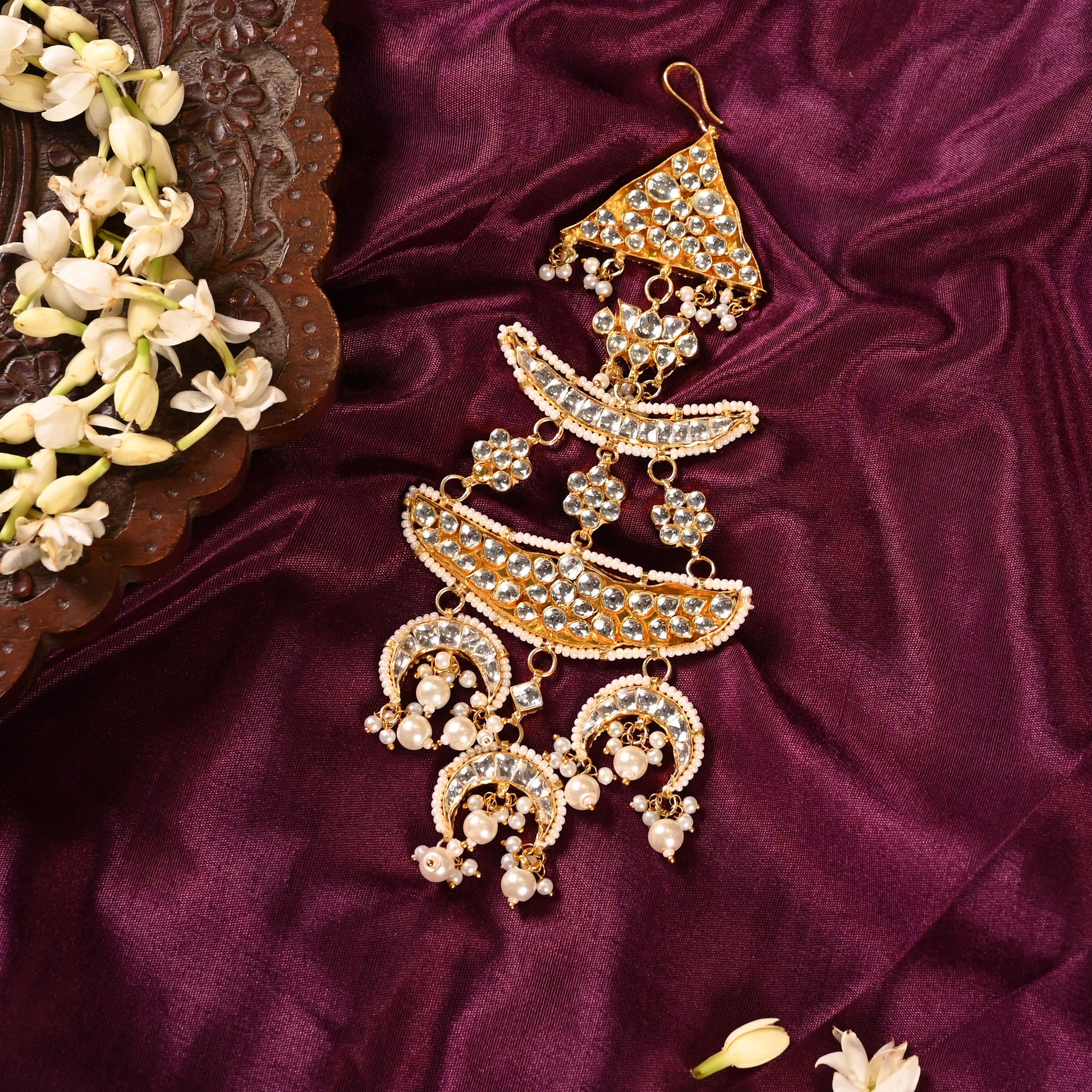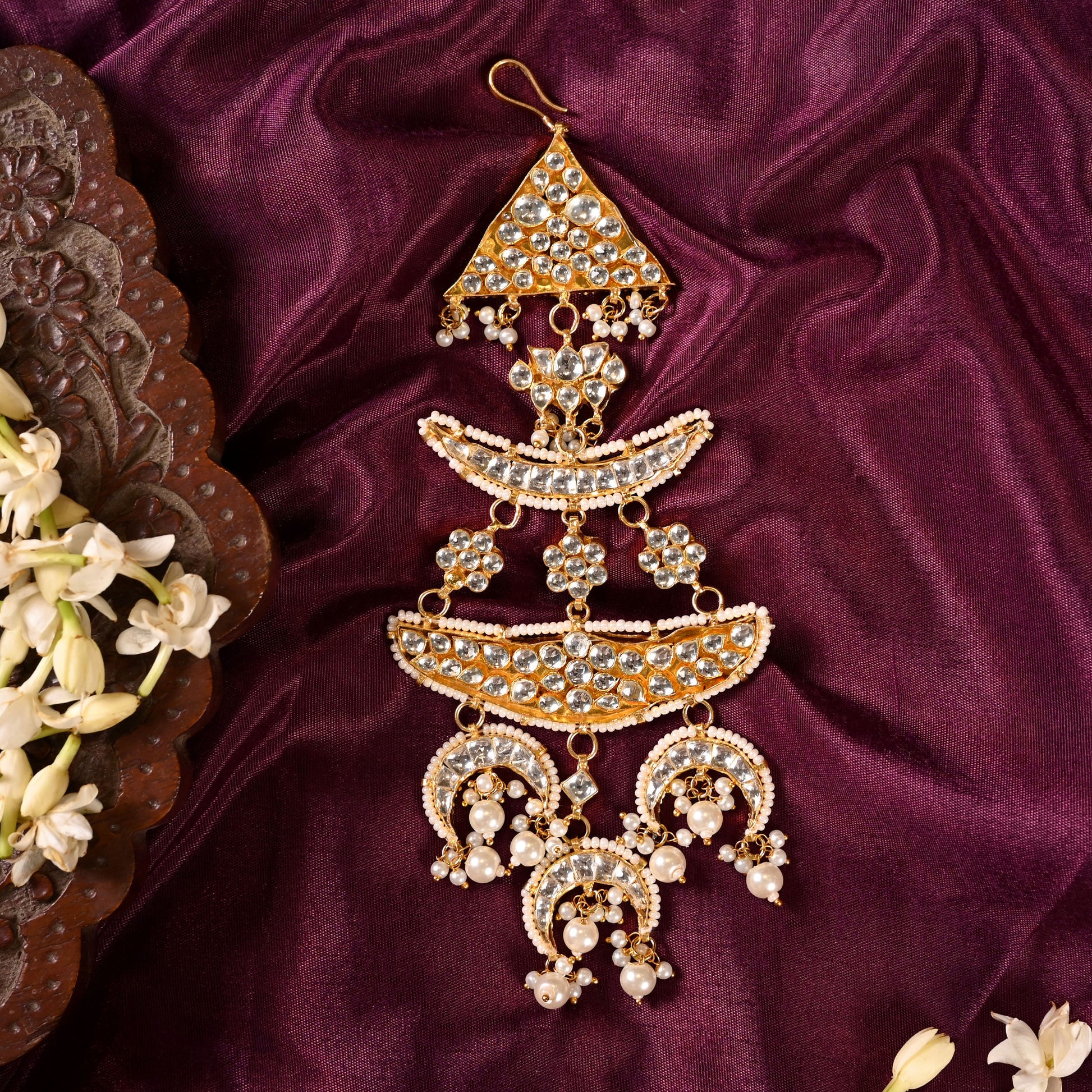 A stunning kundan passa, Sabyasachi inspired design for a fashionable and trendy accessory. This intricately crafted headpiece is perfect for adding a touch of elegance and glamour to any outfit, whether it's for a traditional Indian wedding or a special event.